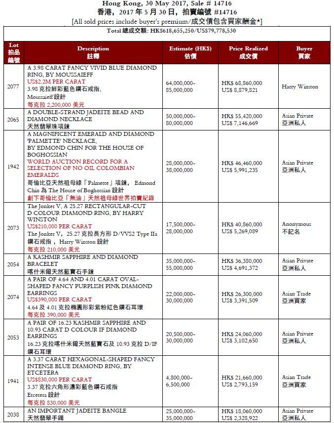 このところHarry Winstonによる歴史的な宝石の落札が続いています。